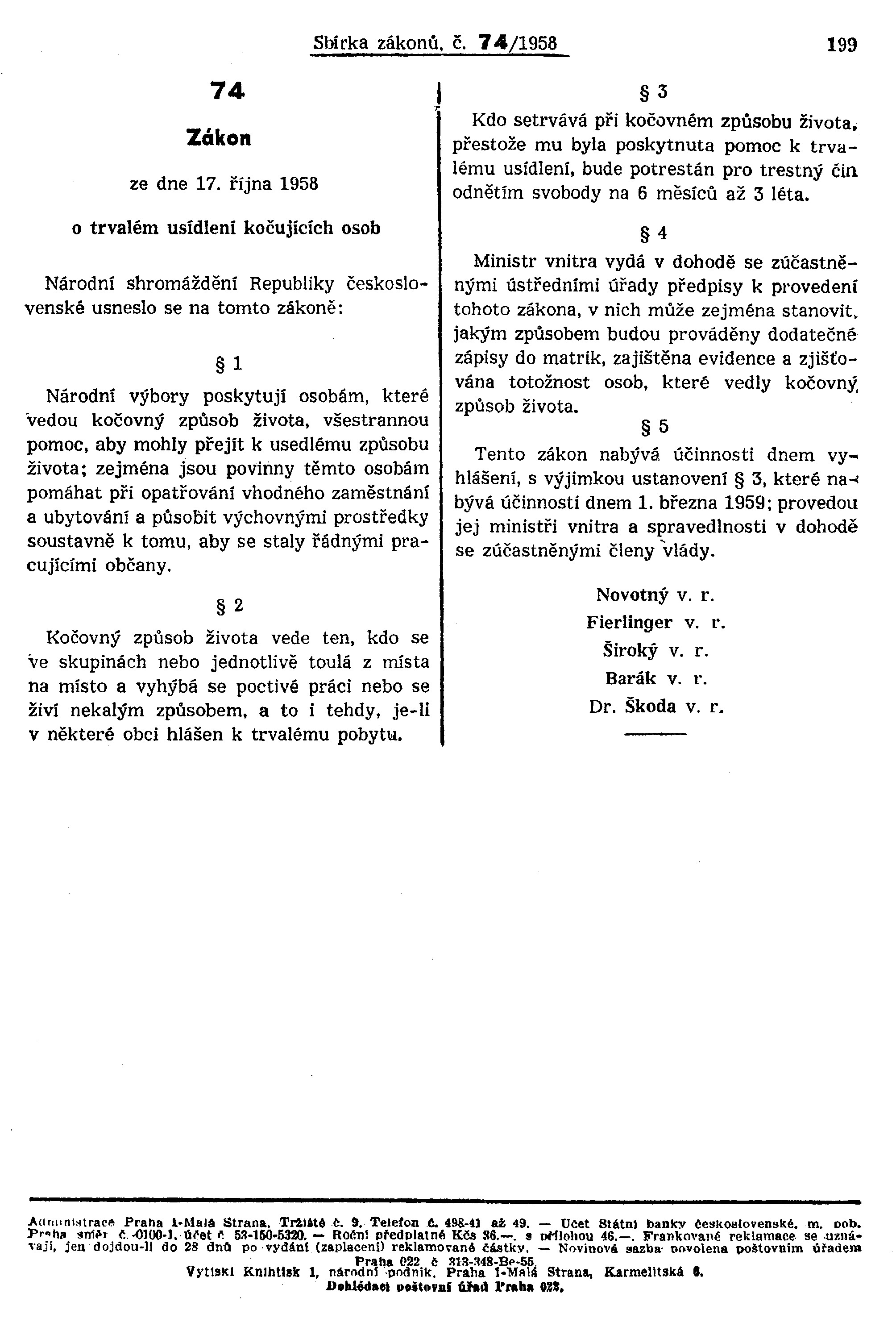 V říjnu 1958 byl schválen zákon č. 74/1958 o trvalém usídlení kočujících osob, pomocí kterého se cílilo trvalé usazení Romů (ač nebyli v zákoně vysloveně zmíněni). Zákon jim měl napomoci najít „vhodné“ zaměstnání a „výchovnými prostředky působit k tomu, aby se staly řádnými pracujícími občany“. Zákon se týkal výslovně taky těch, jež se toulají z místa na místo, živí se nekalým způsobem, a to i tehdy, jsou-li hlášeni v obci k trvalému pobytu. Změnil životy mnoha Romů i dalších osob s tzv. potulným zaměstnáním.
