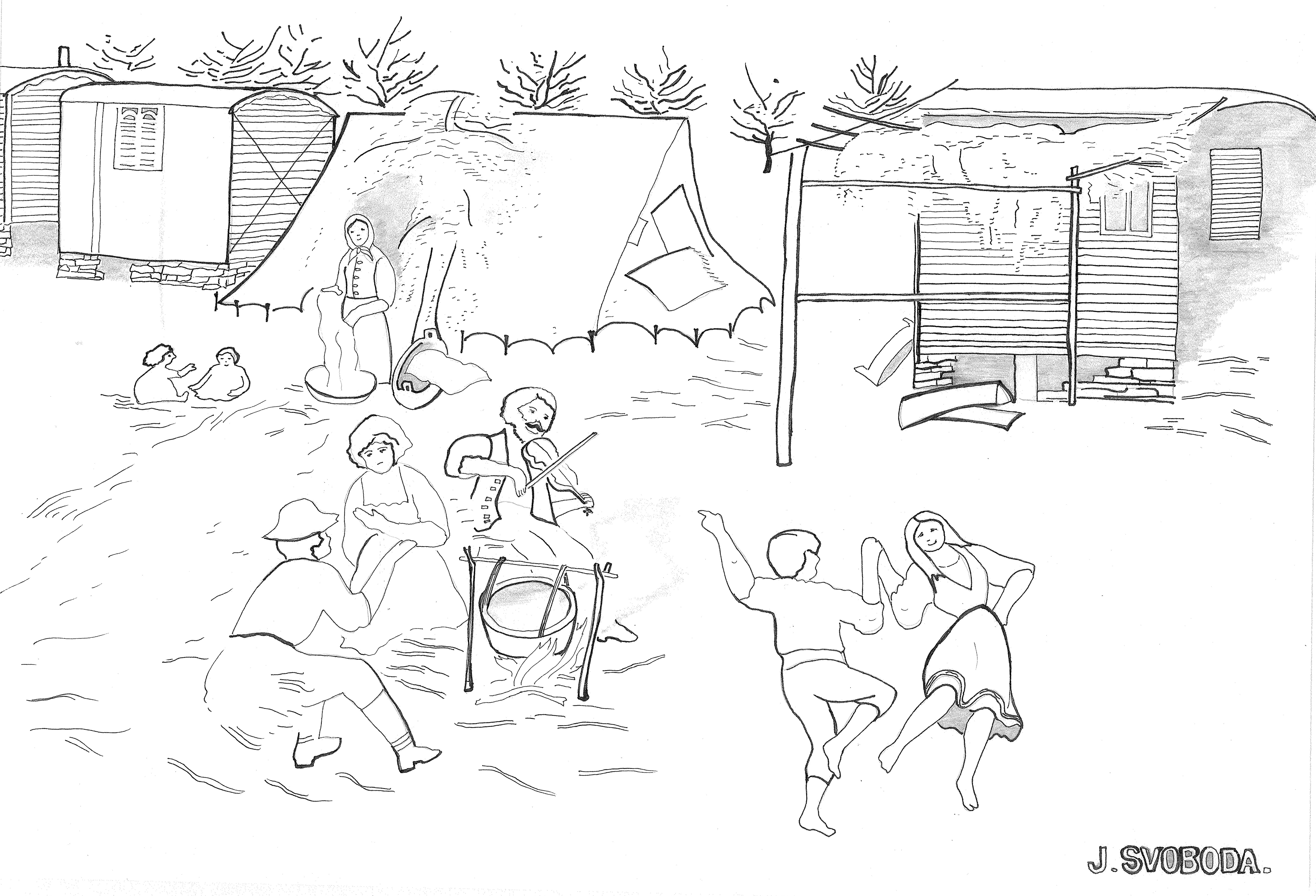 6. Výkresy i s jejich historickými předlohami vystavte ve třídě. V následující hodině můžete s žáky pracovat na téma život uvnitř kolonie a dále uvnitř romských příbytků: rodinné svátky, vaření, vyprávění pohádek.