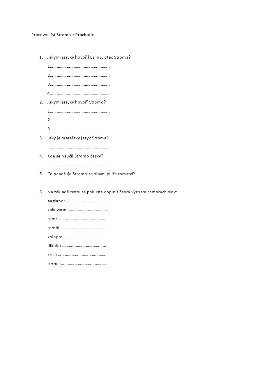Cíle: práce se zdroji, prohloubení znalostí o romském jazyku, zvycích a postojích olašských Romů na základě příběhu pamětníka