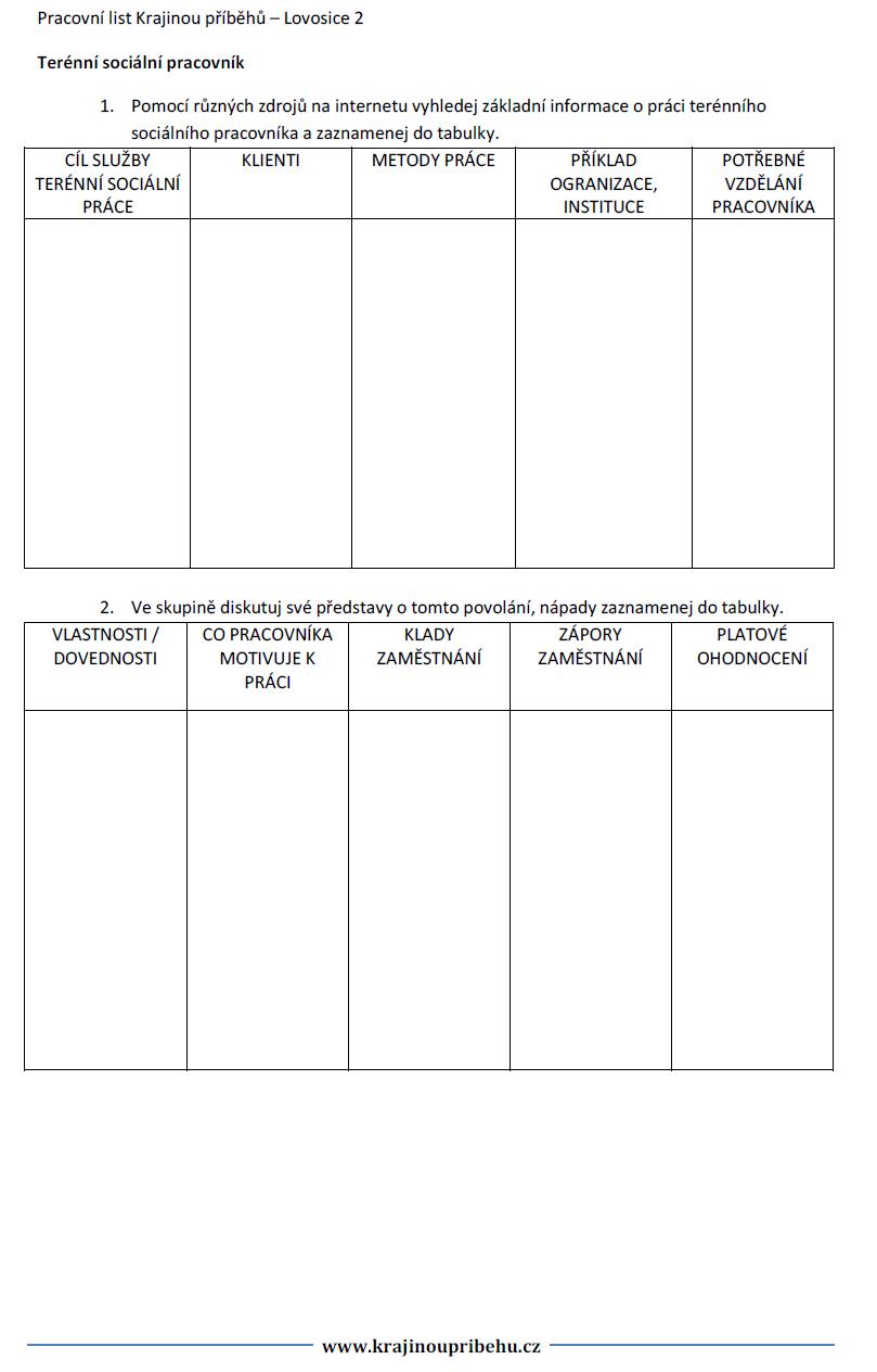 Pomůcky: Text příběhu Dagmar Lendelové, pracovní list Terénní sociální pracovník, internetová učebna, tabule nebo flipchart